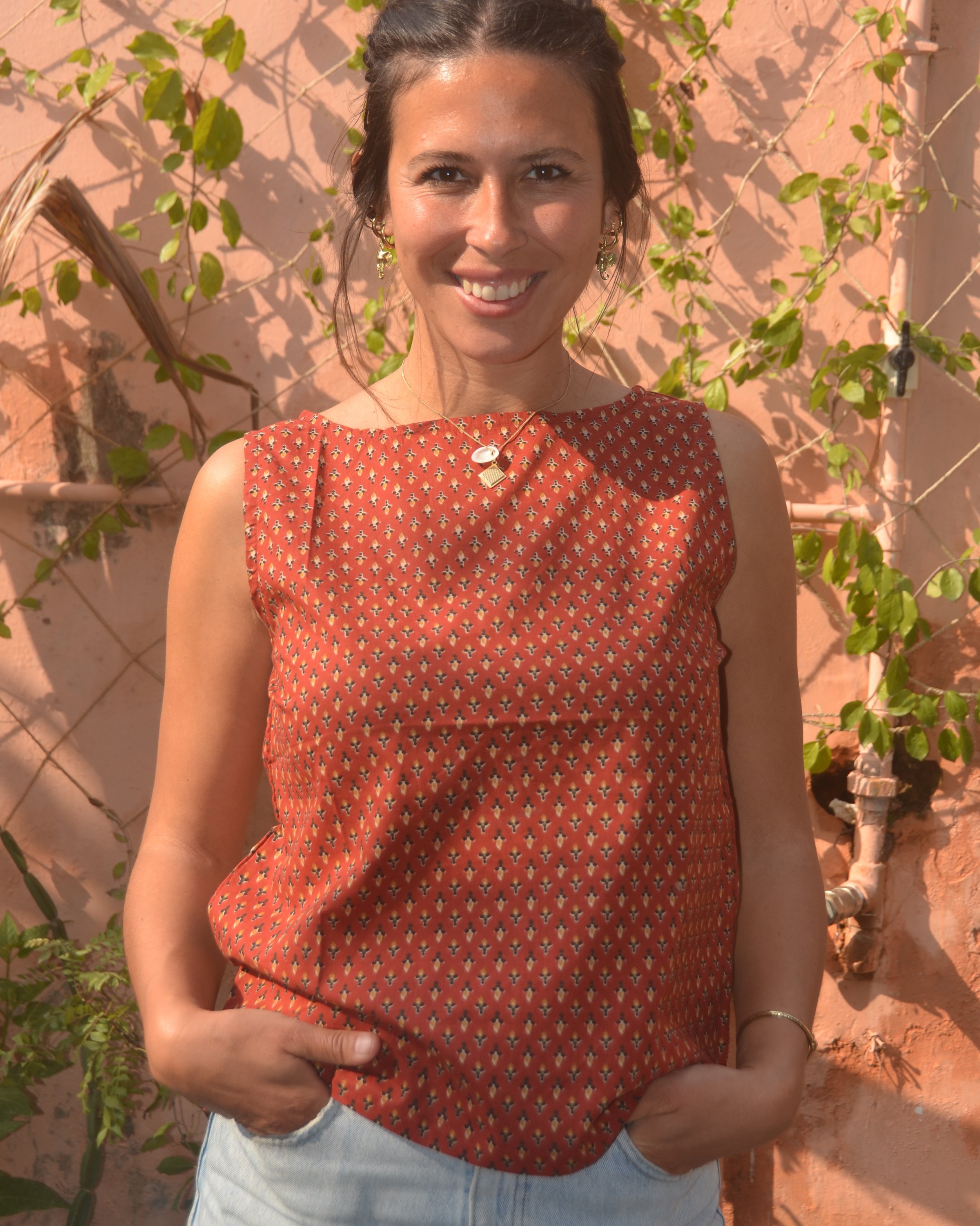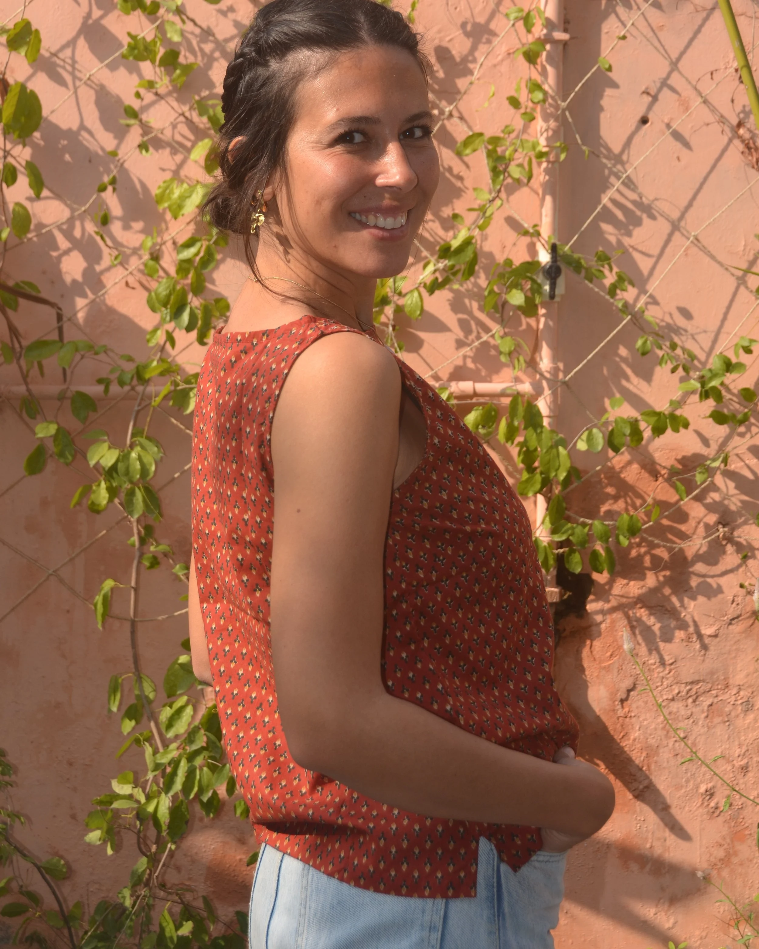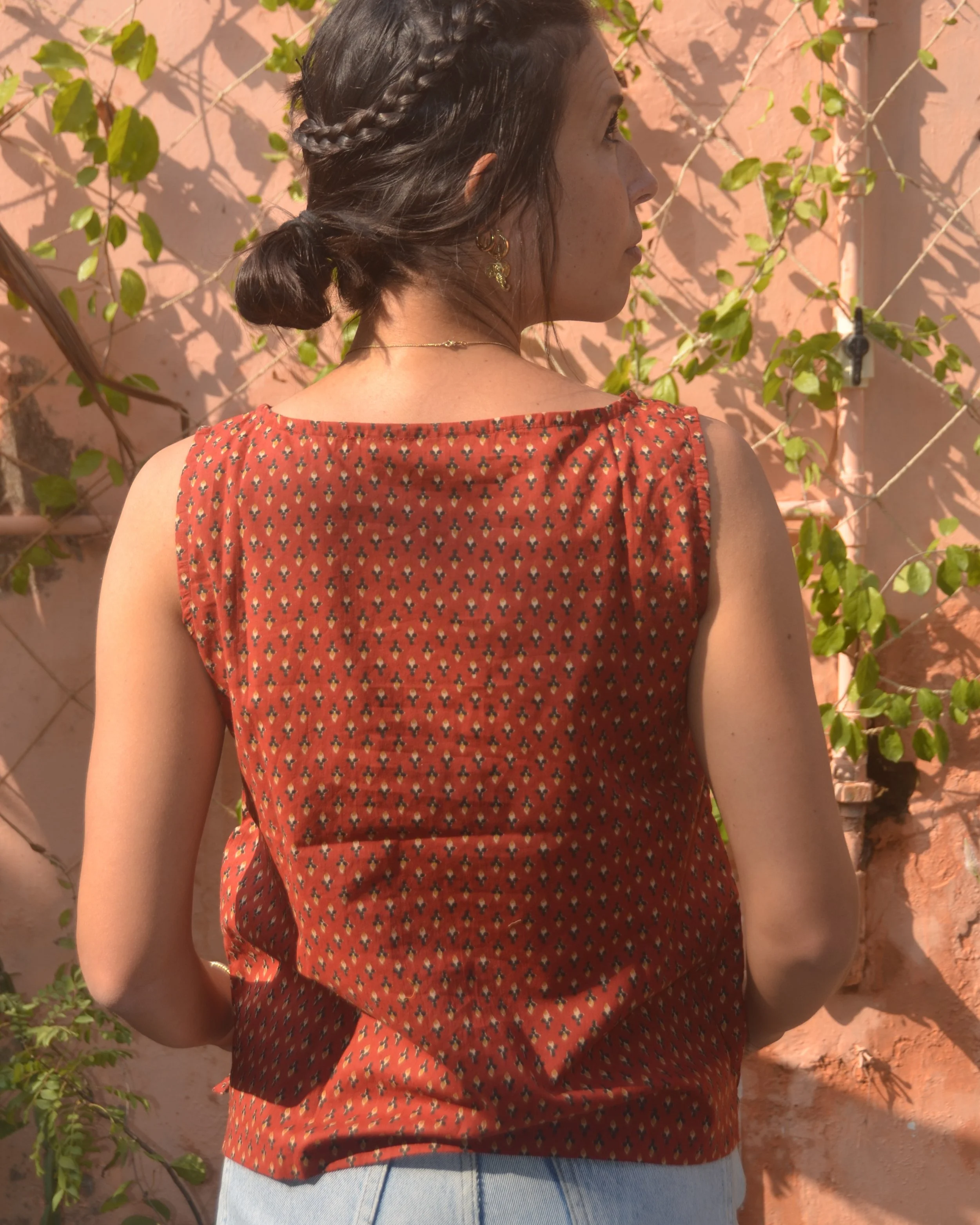 A sleeveless cotton top perfect for pairing with jeans during a relaxed summer afternoon at a cafe. It is available in three stunning blockprints—vermilion red, saffron yellow, and black—and in four sizes: S, M, L, and XL.