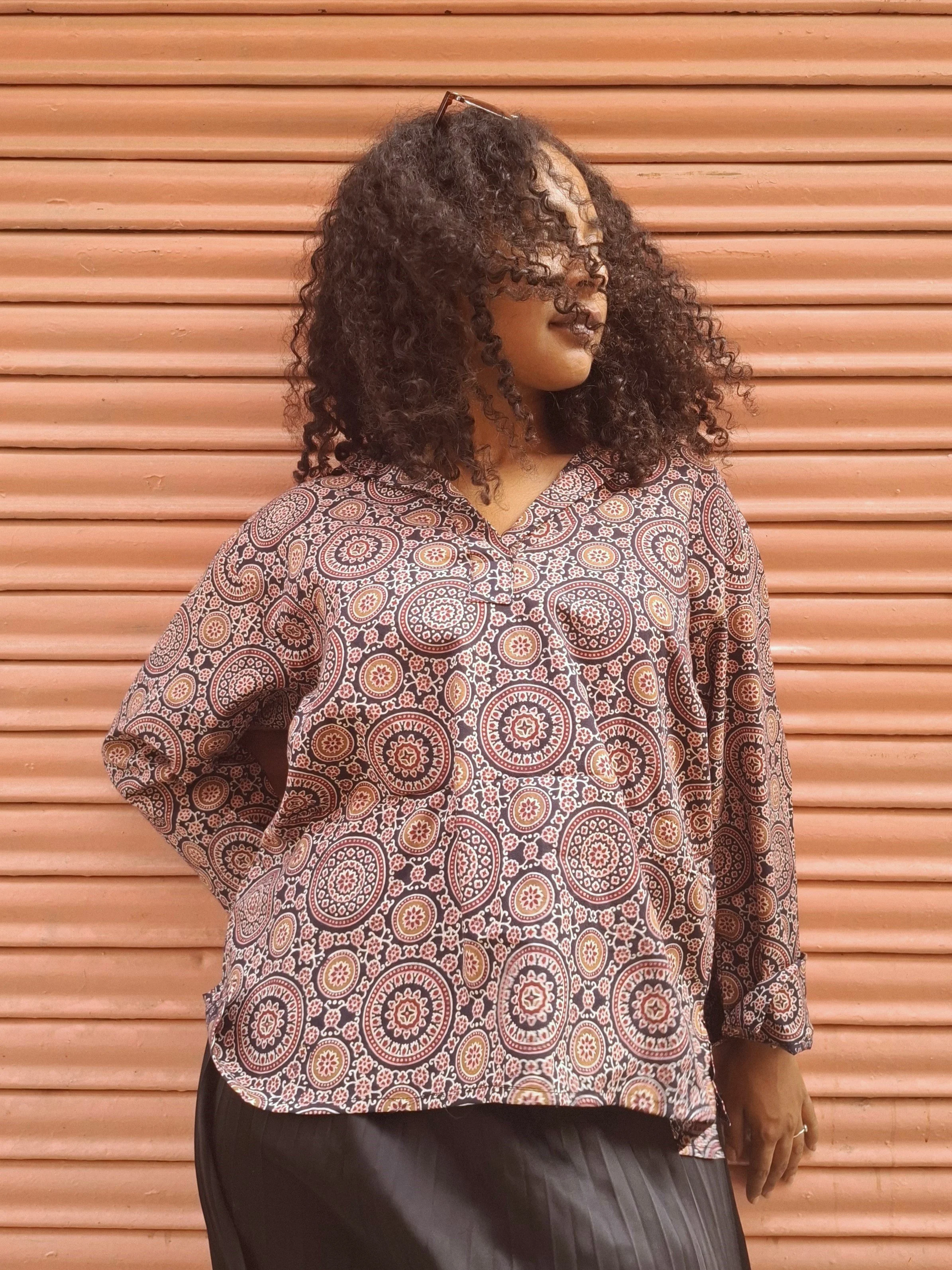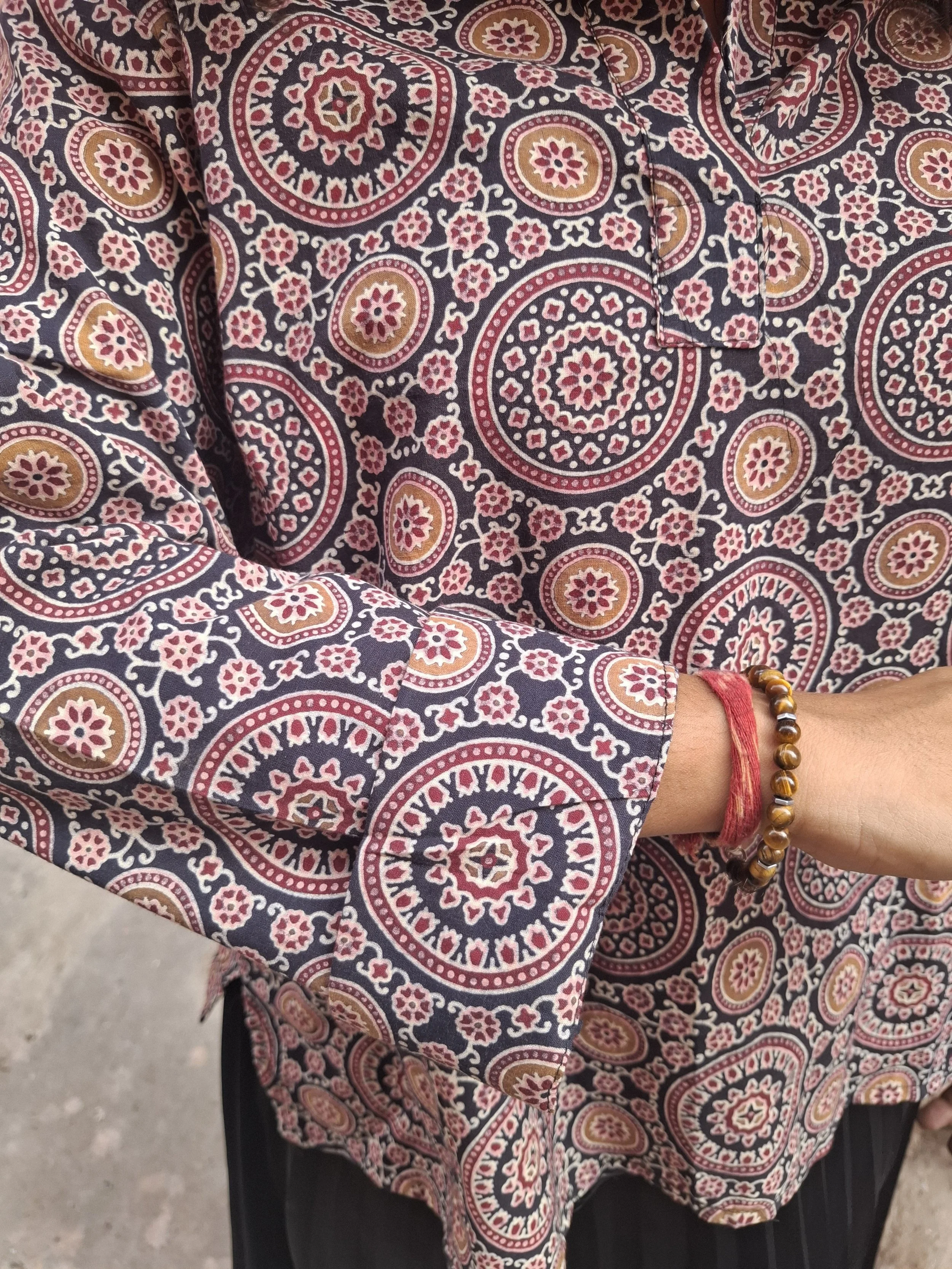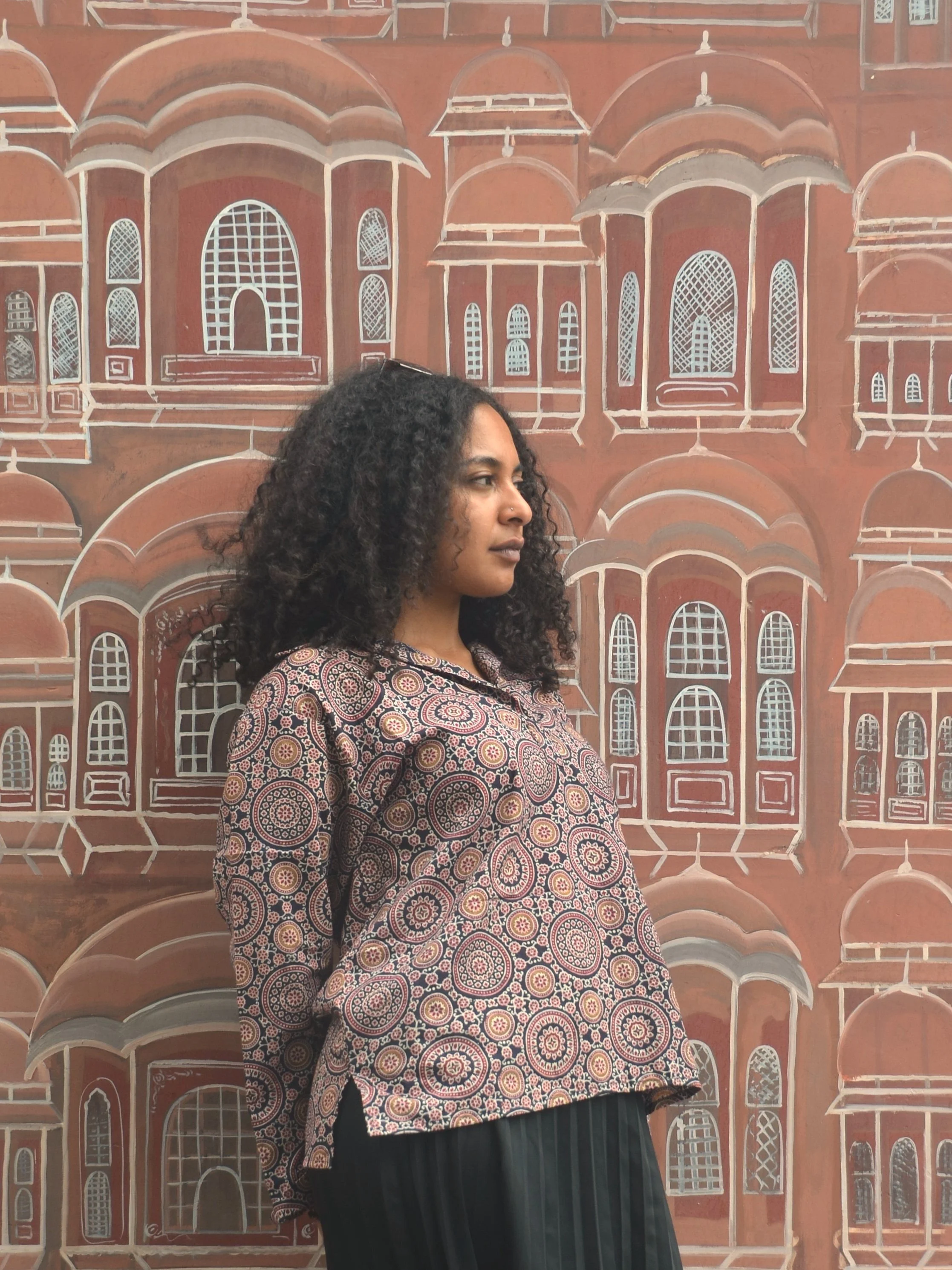 We've refreshed the farmers' blouse with beautiful block prints that showcase Jaipur, India’s craftsmanship and artistry, resulting in an elegant, comfortable long-sleeved blouse made from organic cotton. It is available in three vibrant colors and sizes S, M, L, and XL.