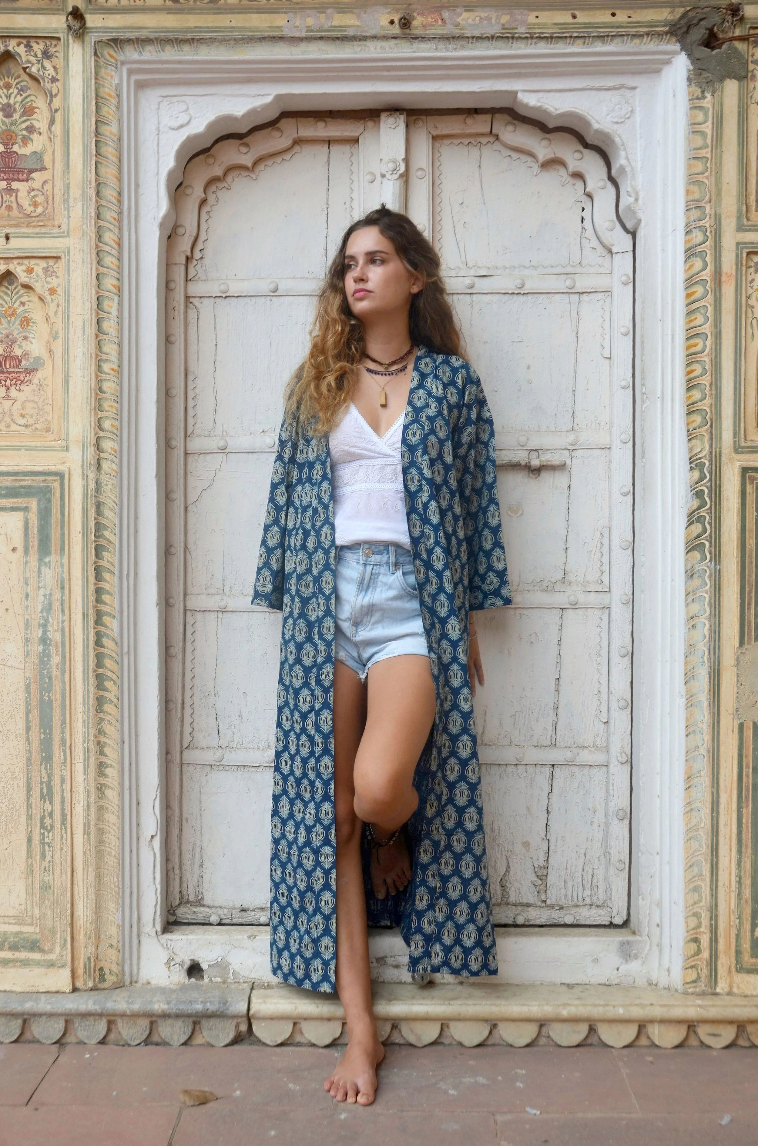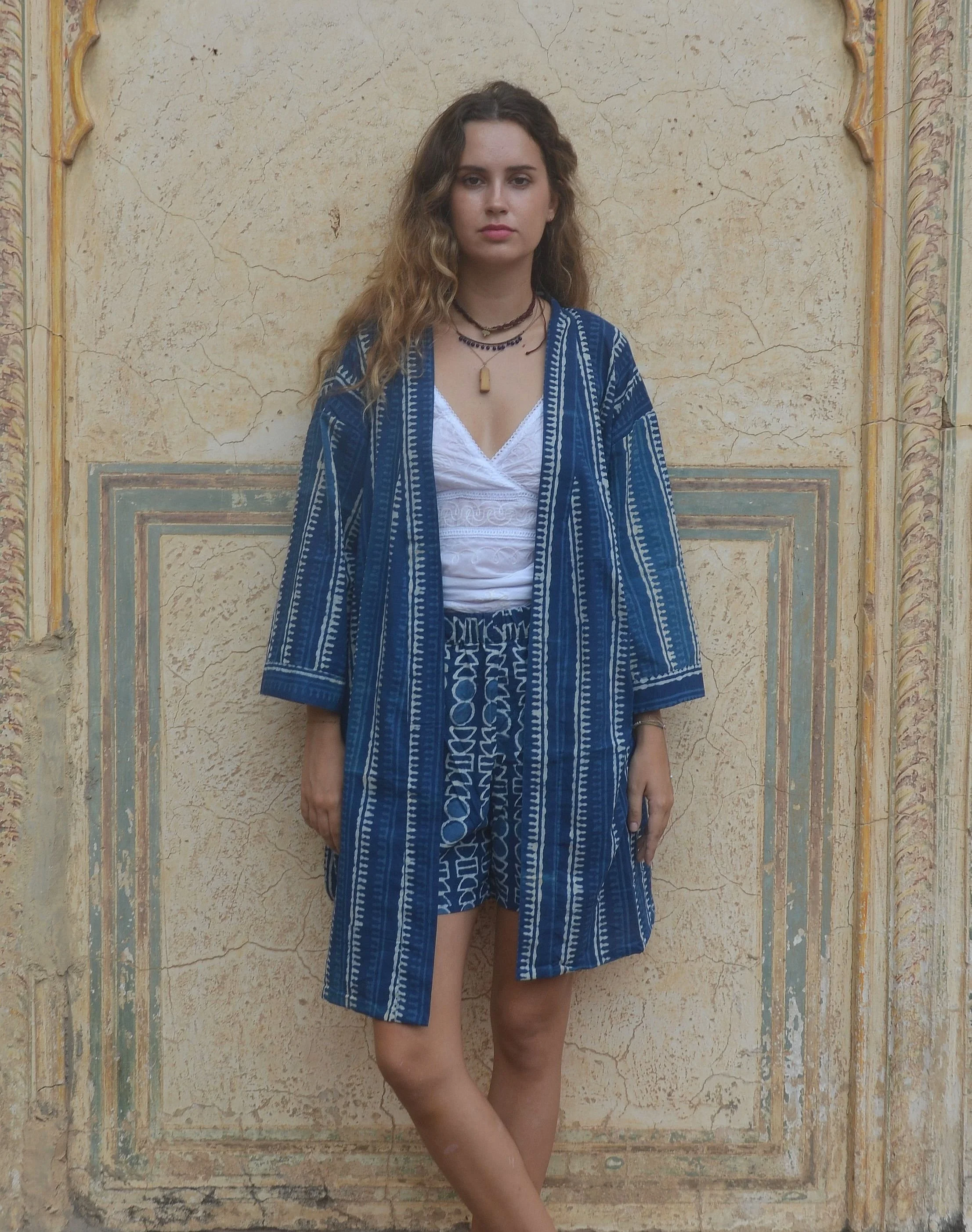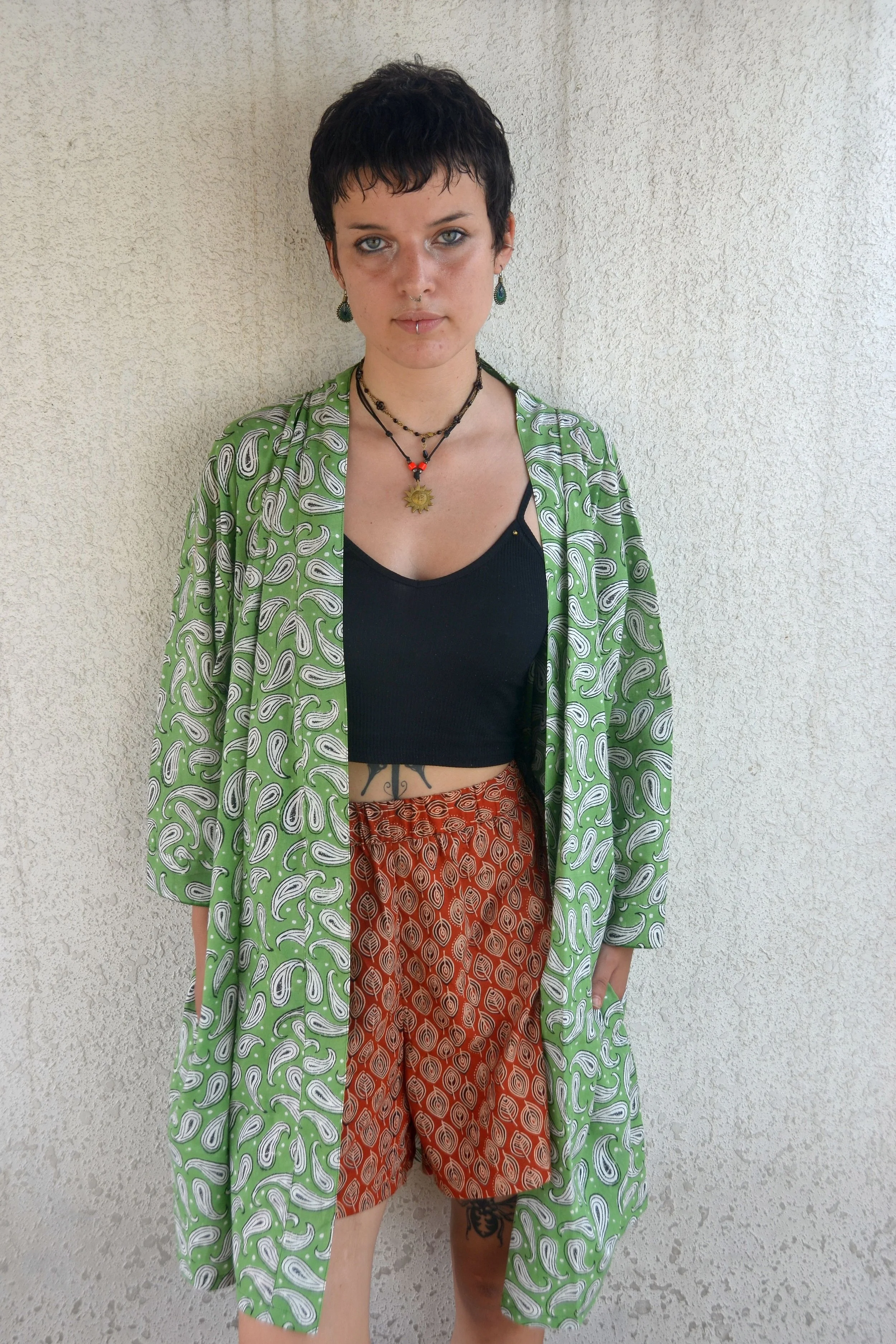 A half-length cotton kimono can be worn as a light jacket, a morning coat, a mini dress, a cover-up over a bikini, or with matching shorts or pants. Ours is made from organic cotton. It has 3/4 sleeves, side seam pockets, and a belt. It is available in a range of vibrant colors and one size fits all.