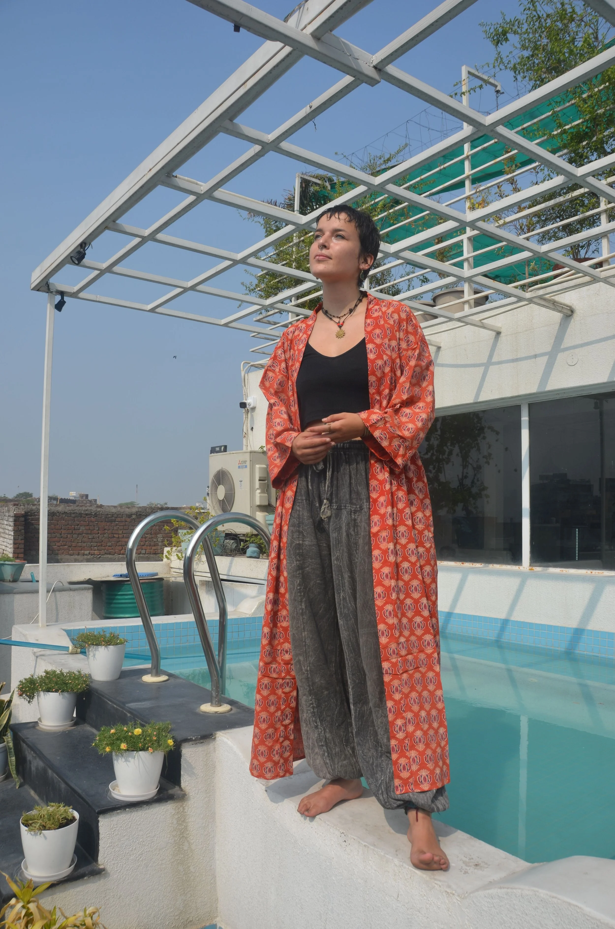 A silk kimono is incredibly versatile! You can rock it as a chic cover-up over your favorite bikini, style it up with trendy denim shorts, or even flaunt it as a stunning dress. Each kimono is 100% silk, crafted from pre-loved sarees, making every piece one-of-a-kind. Plus, the midi-length kimonos are designed to fit everyone and come complete with a belt and handy side-seam pockets. How amazing is that?